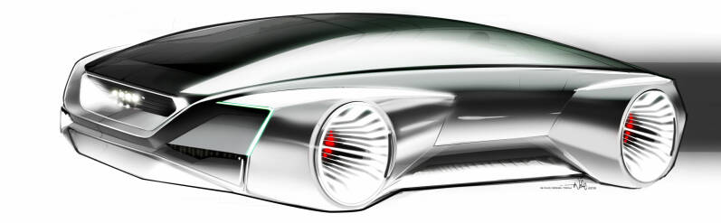 The roof of the vehicle is almost entirely see-through, so the neon green light that picks out details on the interior can be seen from outside. Wheels are surrounded by the car's chassis, with the all-terrain tyres only exposed at contact points with the ground.